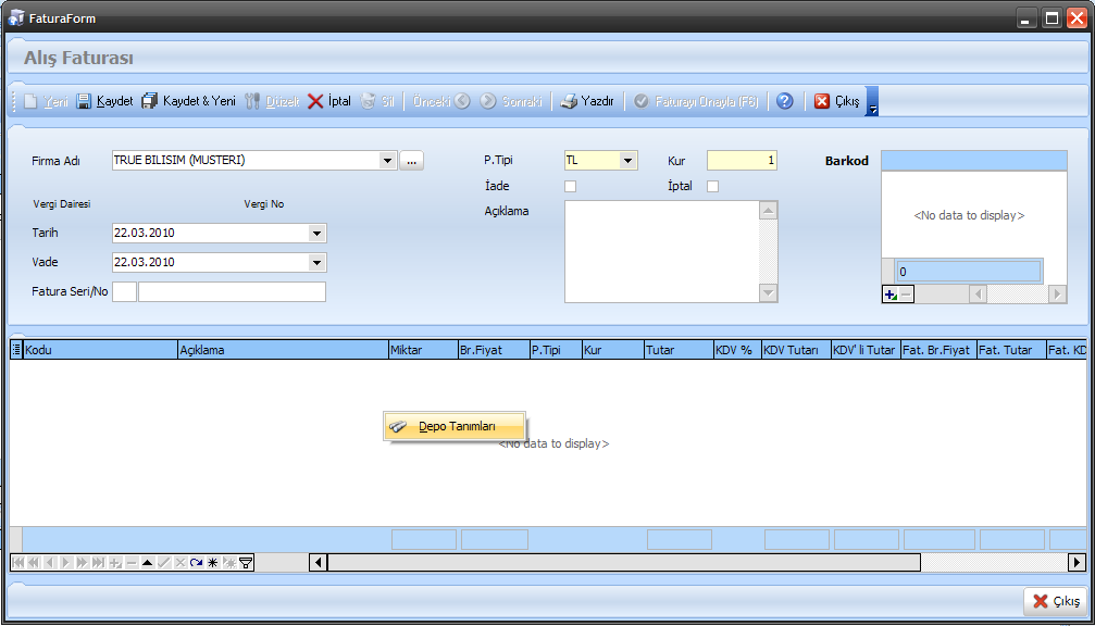 Diğer tanımlama işlemlerini baz alırsak Depo Tanımlamanın kullanımı diğerlerinin yanında çok basittir ve bir o kadar kullanışlıdır. Herhangi bir alış veya satış faturasının üzerindeyken aşağıdaki ekranda da görüldüğü üzere stok girişi yaptığımız alanın üzerinde sağ tıklayarak depo tanımlarını açabiliriz.