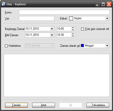 Tüm bu otomatik hatırlatmalar haricinde saatin üzerinde çift tıklayarak aşağıdaki gibi bir konu penceresi açıp kişisel notlarınızı girerek uyarılar ekleyebilirsiniz.