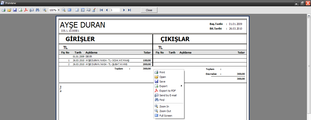 Çalıştığımız müşterilerimiz ve satıcılarımız ile aramızda olan hesap hareketlerinin dip toplamlarını yazdır ekranında karşımıza getirir. Böylelikle karşılıklı mutabık olup olmadığımızı teyitleşebiliriz.Yazdır: