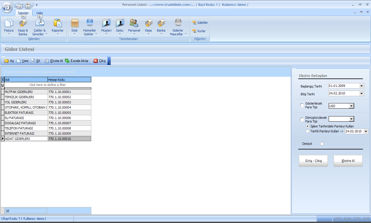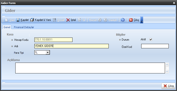 Firmamızda elde ettiğimiz Gelirlerin yanı sıra, gün içerisinde ve genel olarak belli Giderlerimiz (Masraflarımız) olur. Bunlar haricinde yeni giderlerimiz olur ise yeni tuşuna tıklayarak tanımlamalarımızı yapabiliriz.