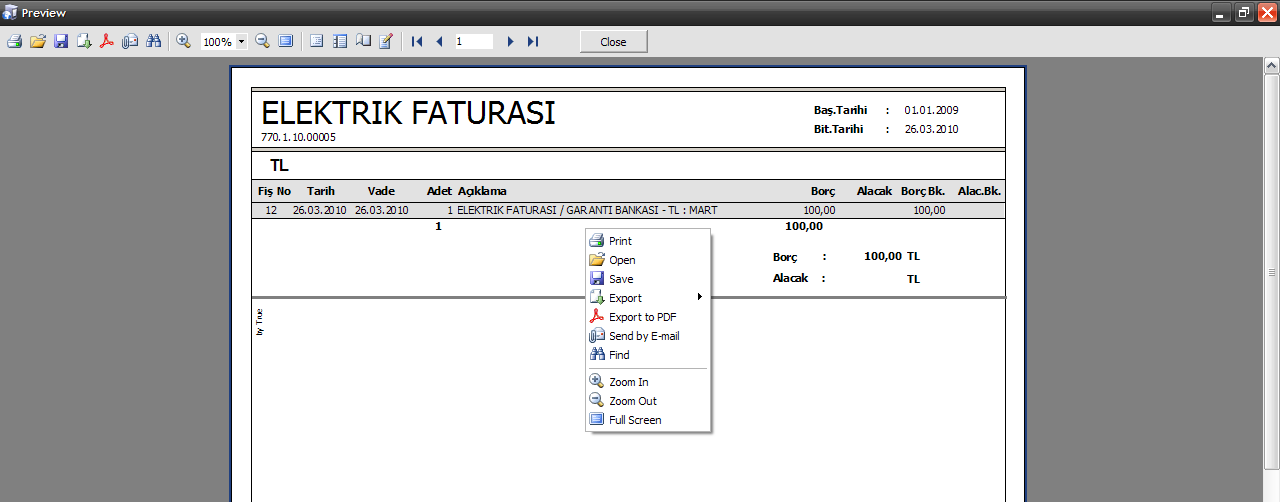Çalıştığımız müşterilerimiz ve satıcılarımız ile aramızda olan hesap hareketlerinin dip toplamlarını yazdır ekranında karşımıza getirir. Böylelikle karşılıklı mutabık olup olmadığımızı teyitleşebiliriz.