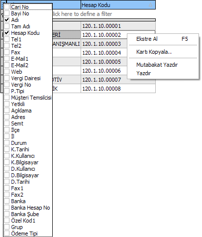 Programda tanımlamalardaki (stok ekranı hariç) liste ekranlarının tümünde fare ile sağ tıkladığımızda aşağıdaki listeyi getirecektir.