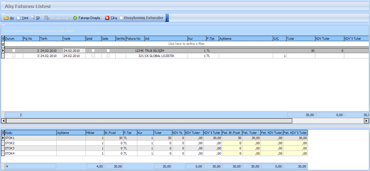 Programın aslında özünde en önemli bölümlerinden biridir.Faturalar Alış veya Satış fark etmeksizin, Onaylanmış Faturalar ve Beklemede olan faturalar olmak üzere iki grupta toplanır.Bir faturanın kaydını yaptığımız anda fatura aşağıdaki listede de görüldüğü gibi Beklemede olan faturalar listesinde gözükecektir.Bu faturayı onayladığımızda ise kontrol mekanizmasından geçirdiğimiz komutunu verip müşterinin carisine bakiyeyi yazmış olacağız.Durumu özetleyecek olursak.Her giriş yaptığımız faturayı doğruluğundan emin olduğumuz anda müşterinin veya satıcının carisine yazılması için Onaylamamız gerekmektedir.