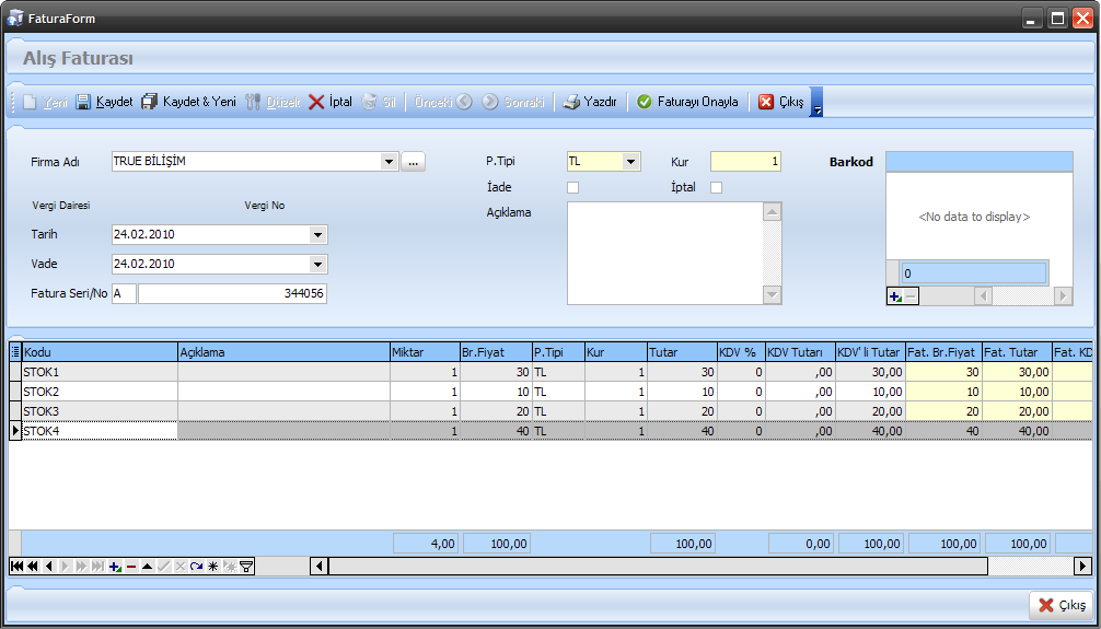 Alış veya satış yaptığımız bir ürünün seri takibi için bilgi amaçlı olarak Barkod hanesini kullanabiliriz. Örneğin; Bir elektronik eşya satıcısıyız.Aynı marka ve model her hangi bir üründen elimizde 100lerce mevcut durumda; alışları da satışları da seri numaraları üzerinden takibi açısından Barkod hanesini kullanabiliriz.Kullanımı için ‘+’ tuşuna veya kutucuğun içerisinde boş bir noktaya tıklayıp klavyenin alt ok tuşuna basarak bir satır açıp içerisine bilgi girişi yapabiliriz.